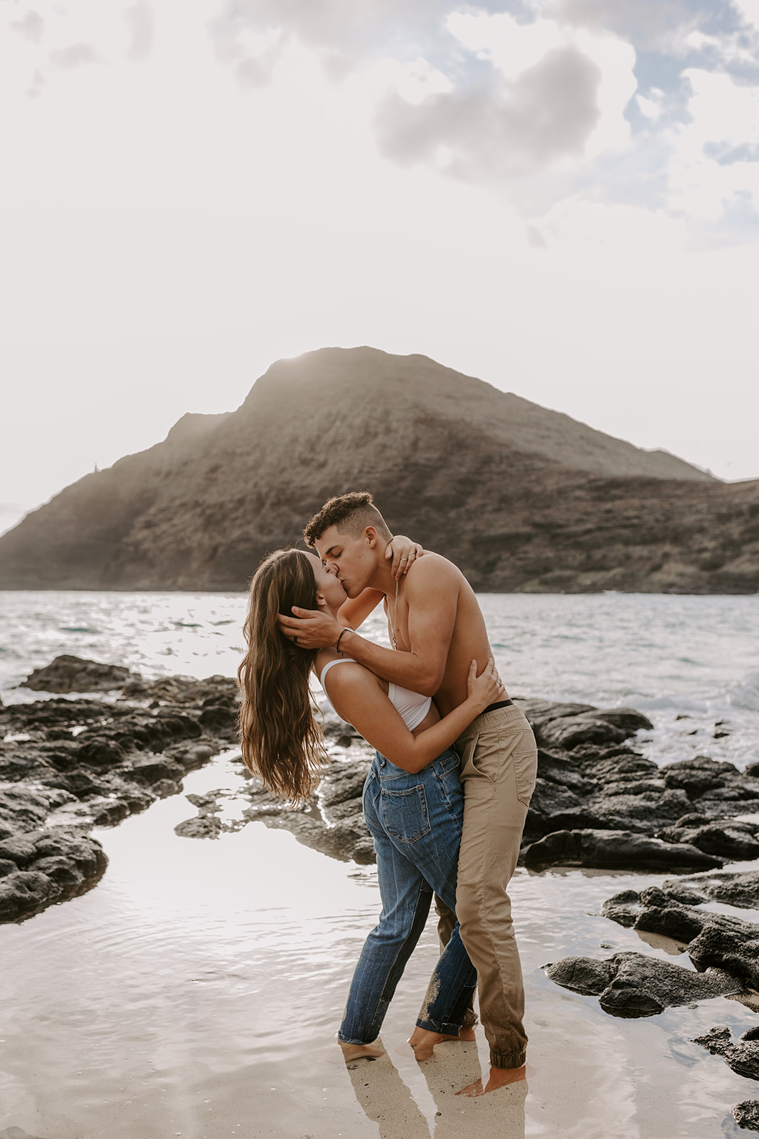 We met at a hidden gem of a beach on the eastern side of Oahu at sunrise. If you thought their session on Makapu’u beach was gorgeous, you’re about to have your breath taken away by their elopement portraits on this private beach! While Scarlett and Nate didn’t officially get married with me, we took some FIRE elopement portraits! So this is your sign, that even if you are already married, that you can still go on an epic adventure with me to take some BREATHTAKING wedding portraits 😉