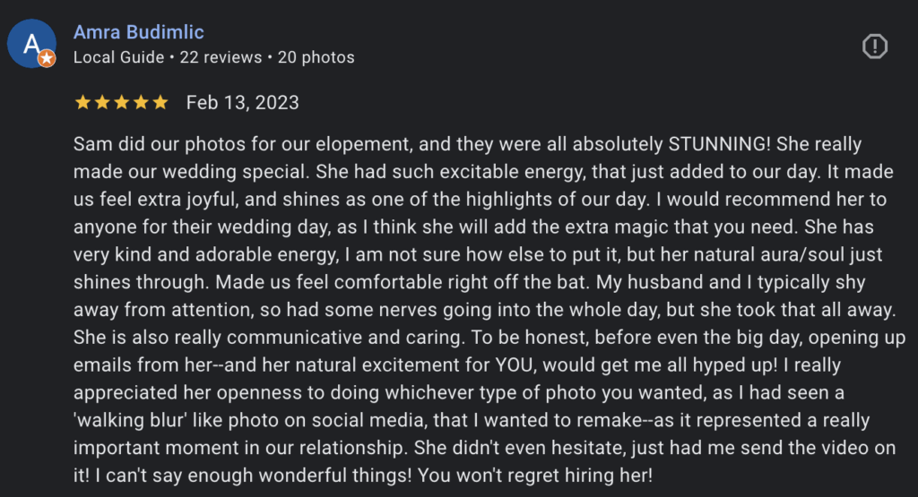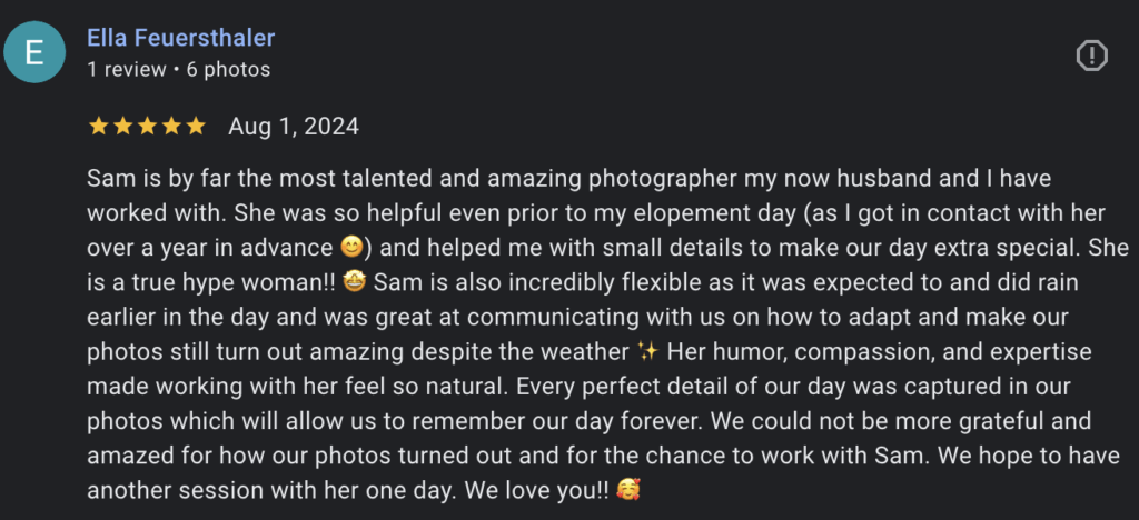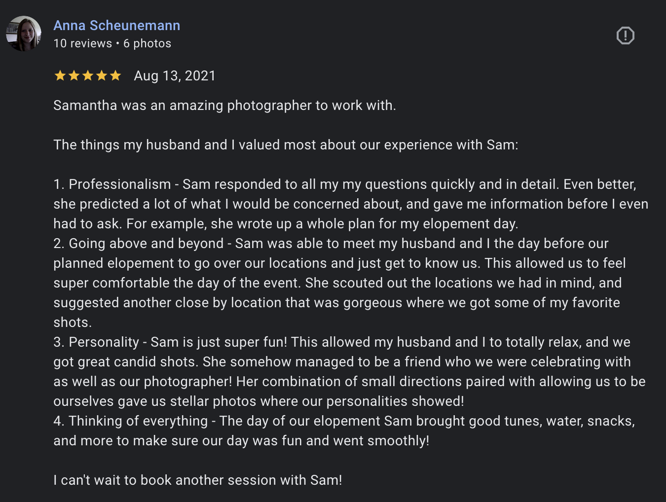 So when your review says something like, “We loved having Samantha as our elopement photographer,” you’re actually doing me a huge favor. You’re telling Google, “Hey, this business is an elopement photographer!” and helping future couples find me.